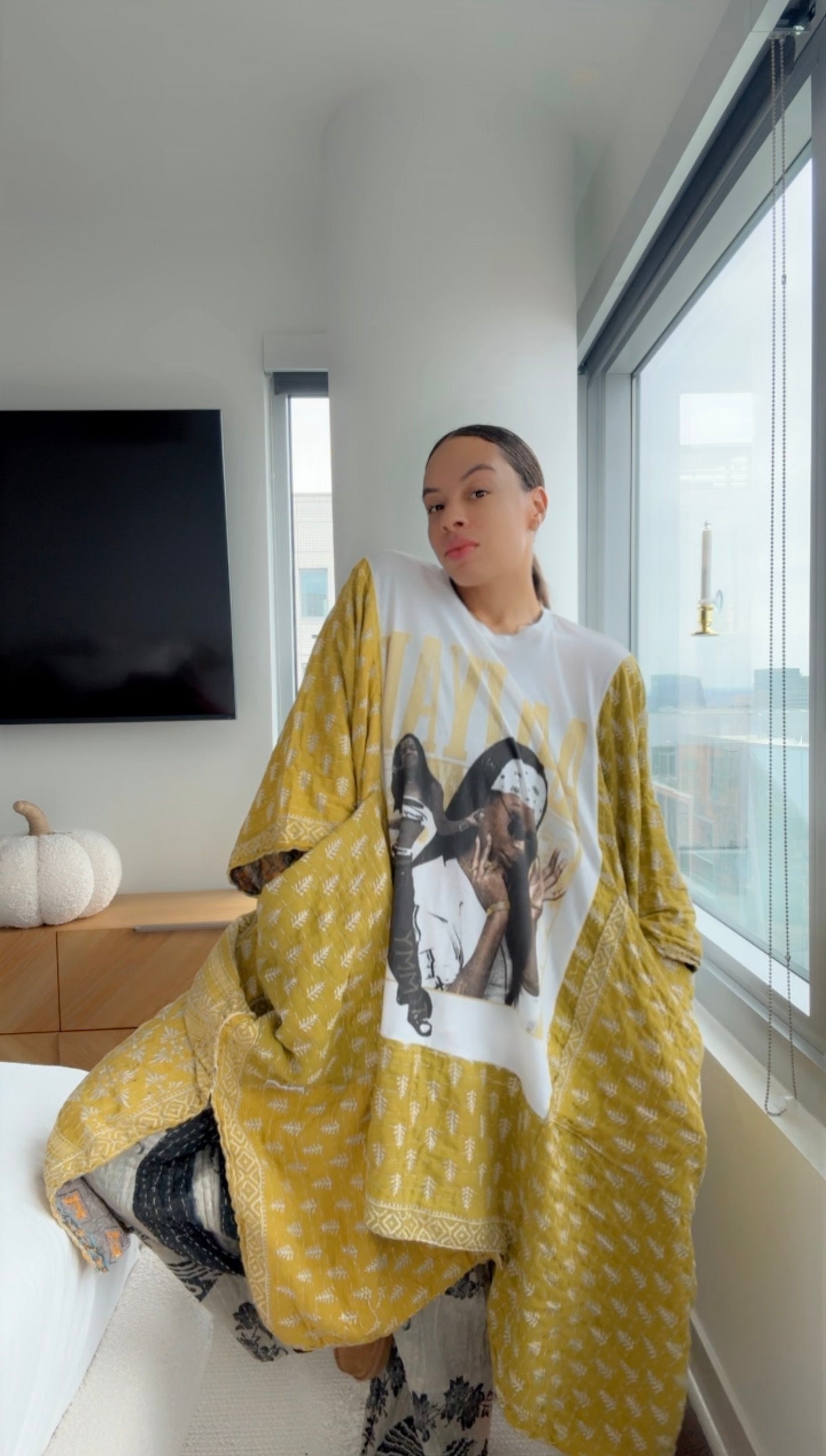 Each Kantha Band Tee Muu is a one-of-a-kind creation, handcrafted by combining iconic band tees with hand-stitched Kantha quilts. Designed for effortless style and ultimate comfort, this piece is a bold blend of edgy and earthy — perfect for those who want to stand out while keeping it laid-back.