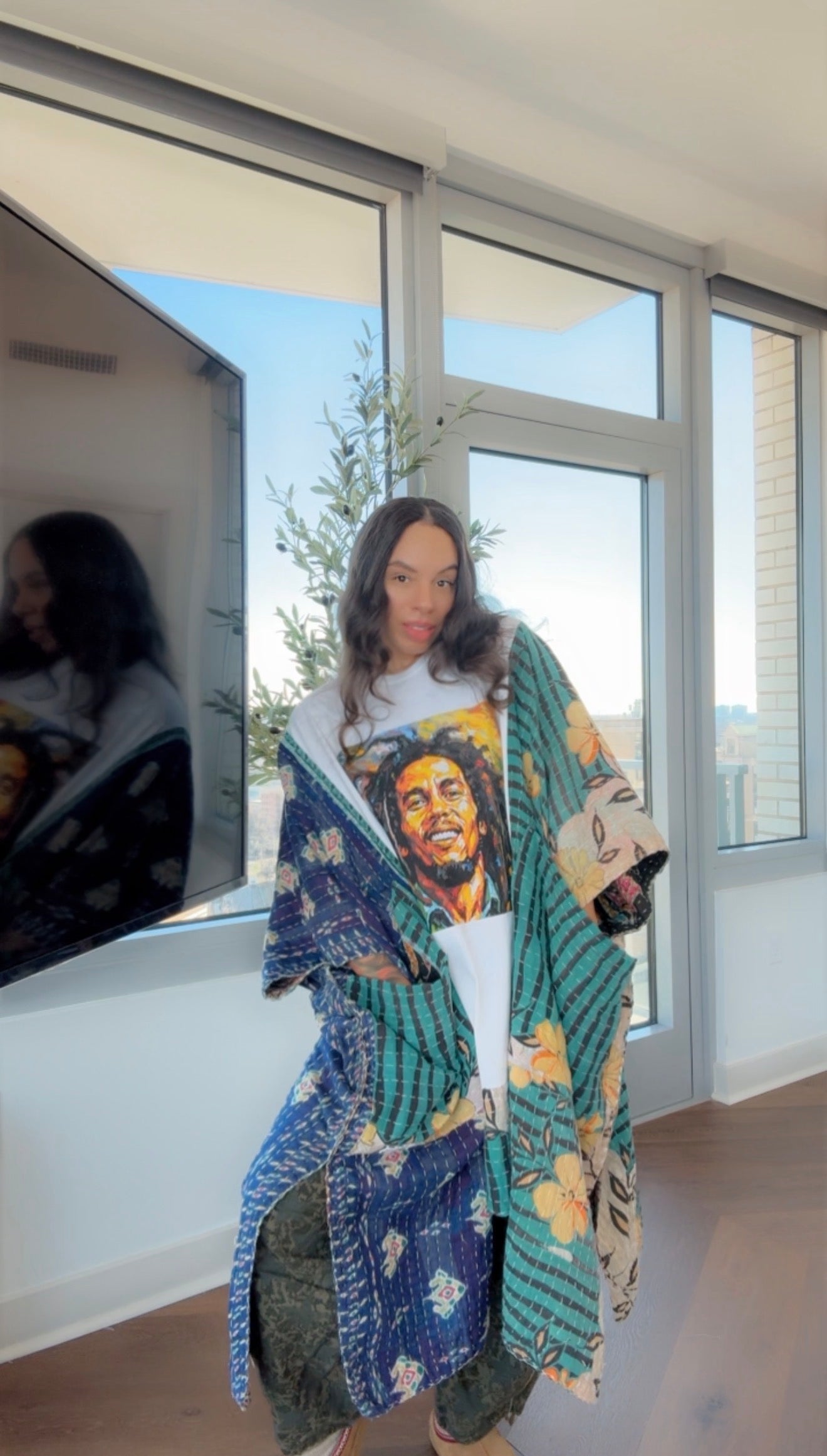 Each Kantha Band Tee Muu is a one-of-a-kind creation, handcrafted by combining iconic band tees with hand-stitched Kantha quilts. Designed for effortless style and ultimate comfort, this piece is a bold blend of edgy and earthy — perfect for those who want to stand out while keeping it laid-back.
