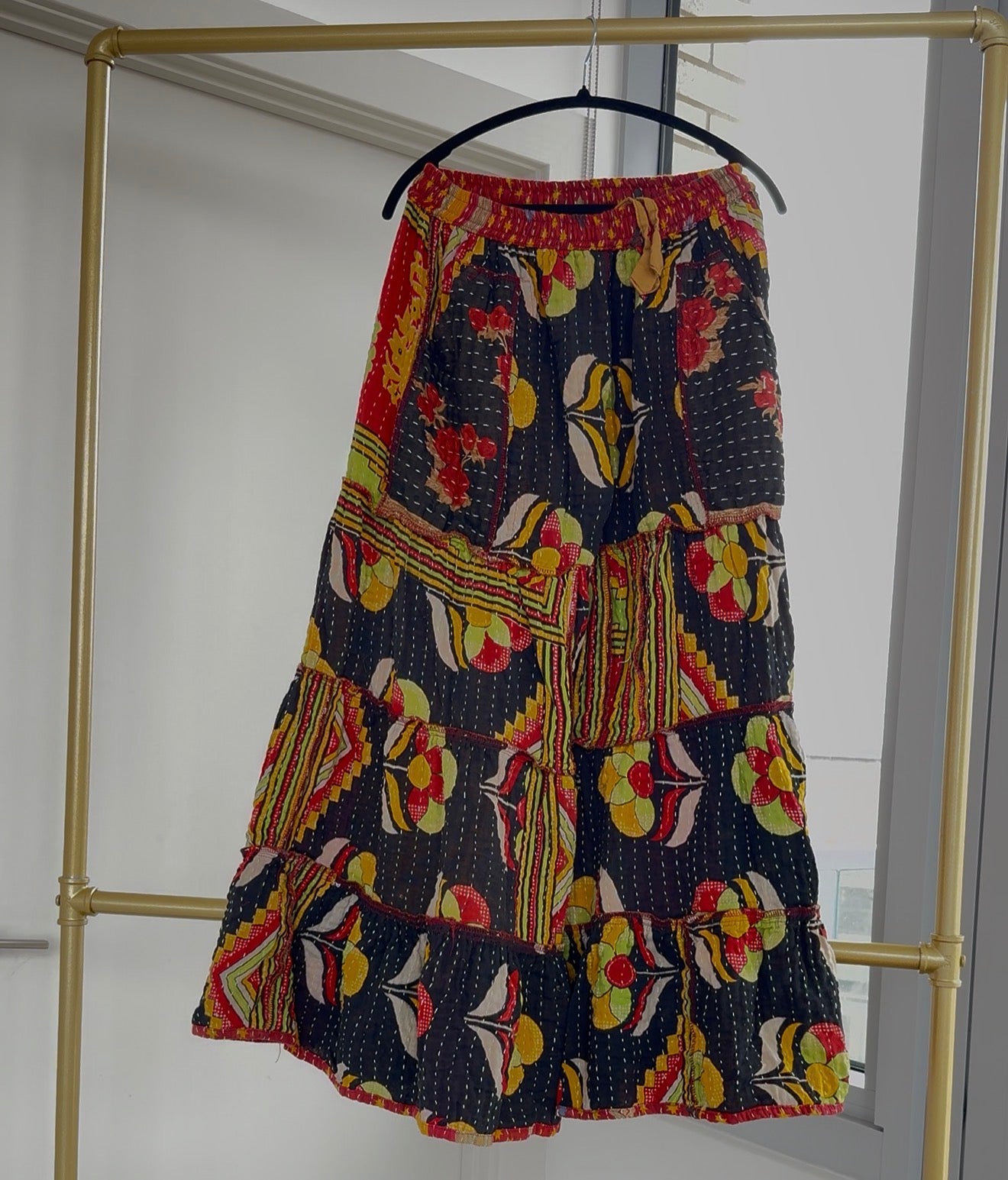 These three-tiered layered Kantha pants are a true statement piece—crafted from vintage Kantha textiles and reimagined into flowy, movement-rich pants that feel as good as they look. Each pair tells a story through layers of hand-stitched cotton, making no two pairs exactly alike.
