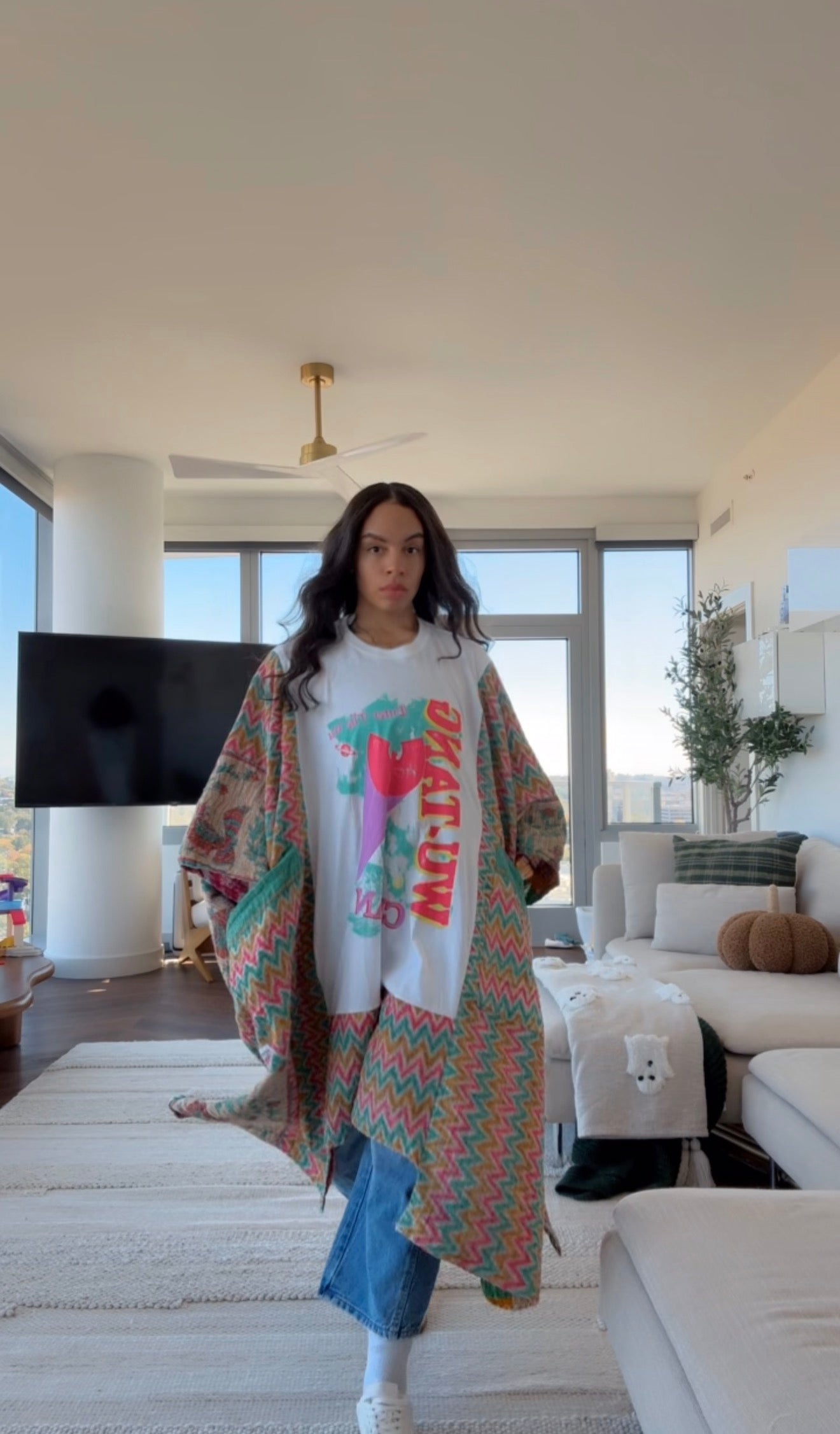 Each Kantha Band Tee Muu is a one-of-a-kind creation, handcrafted by combining iconic band tees with hand-stitched Kantha quilts. Designed for effortless style and ultimate comfort, this piece is a bold blend of edgy and earthy — perfect for those who want to stand out while keeping it laid-back.