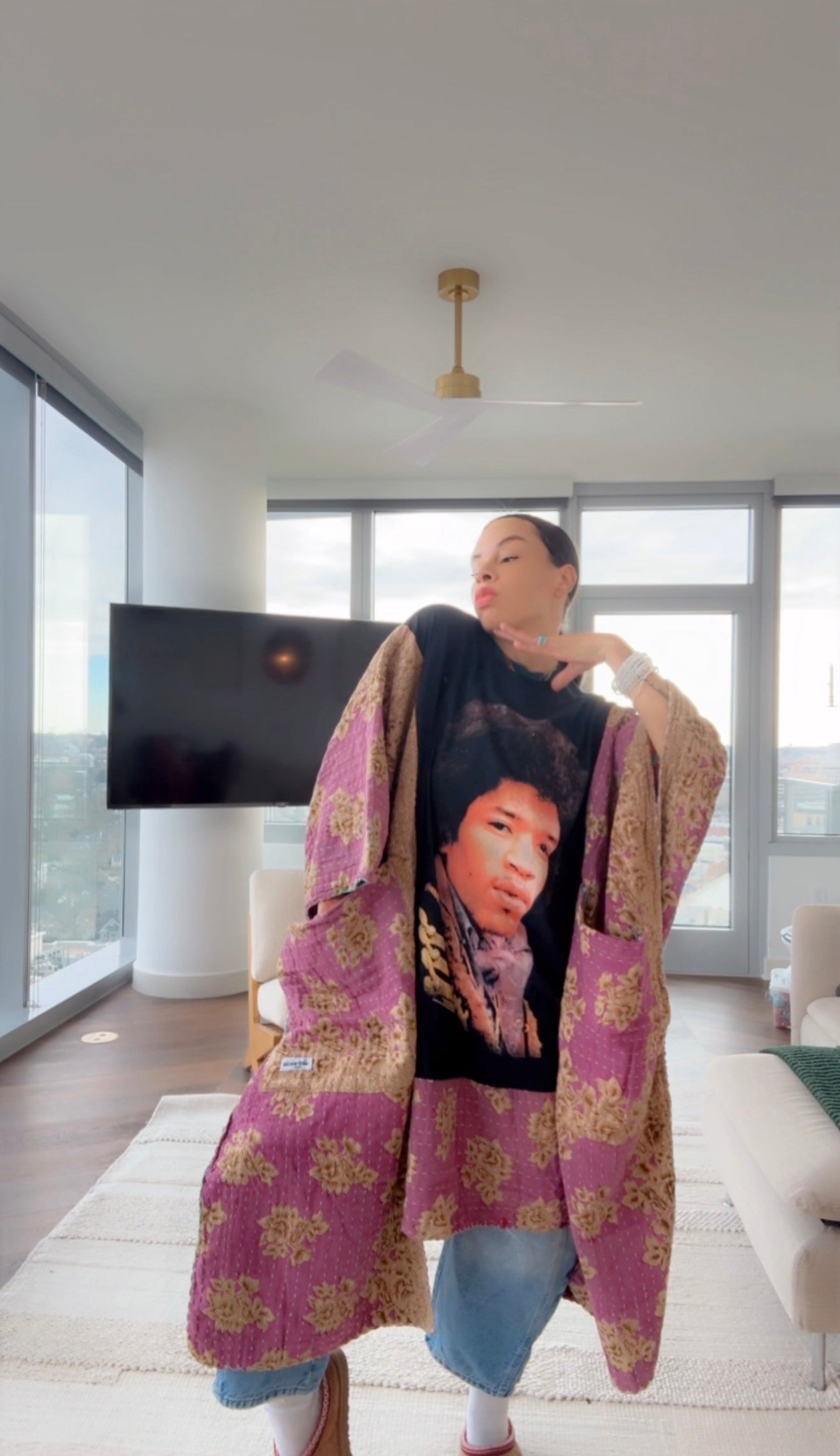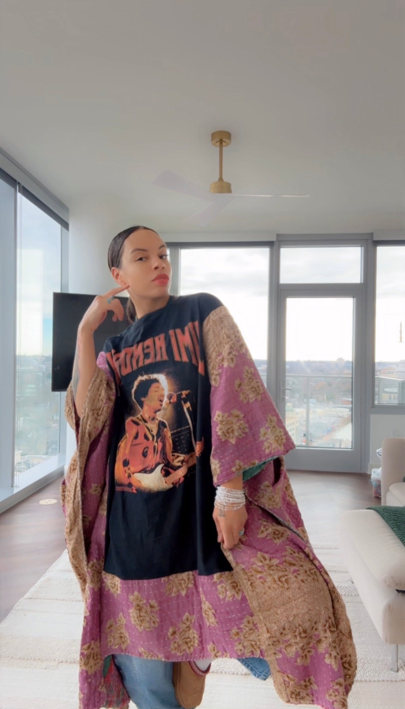 Each Kantha Band Tee Muu is a one-of-a-kind creation, handcrafted by combining iconic band tees with hand-stitched Kantha quilts. Designed for effortless style and ultimate comfort, this piece is a bold blend of edgy and earthy — perfect for those who want to stand out while keeping it laid-back.