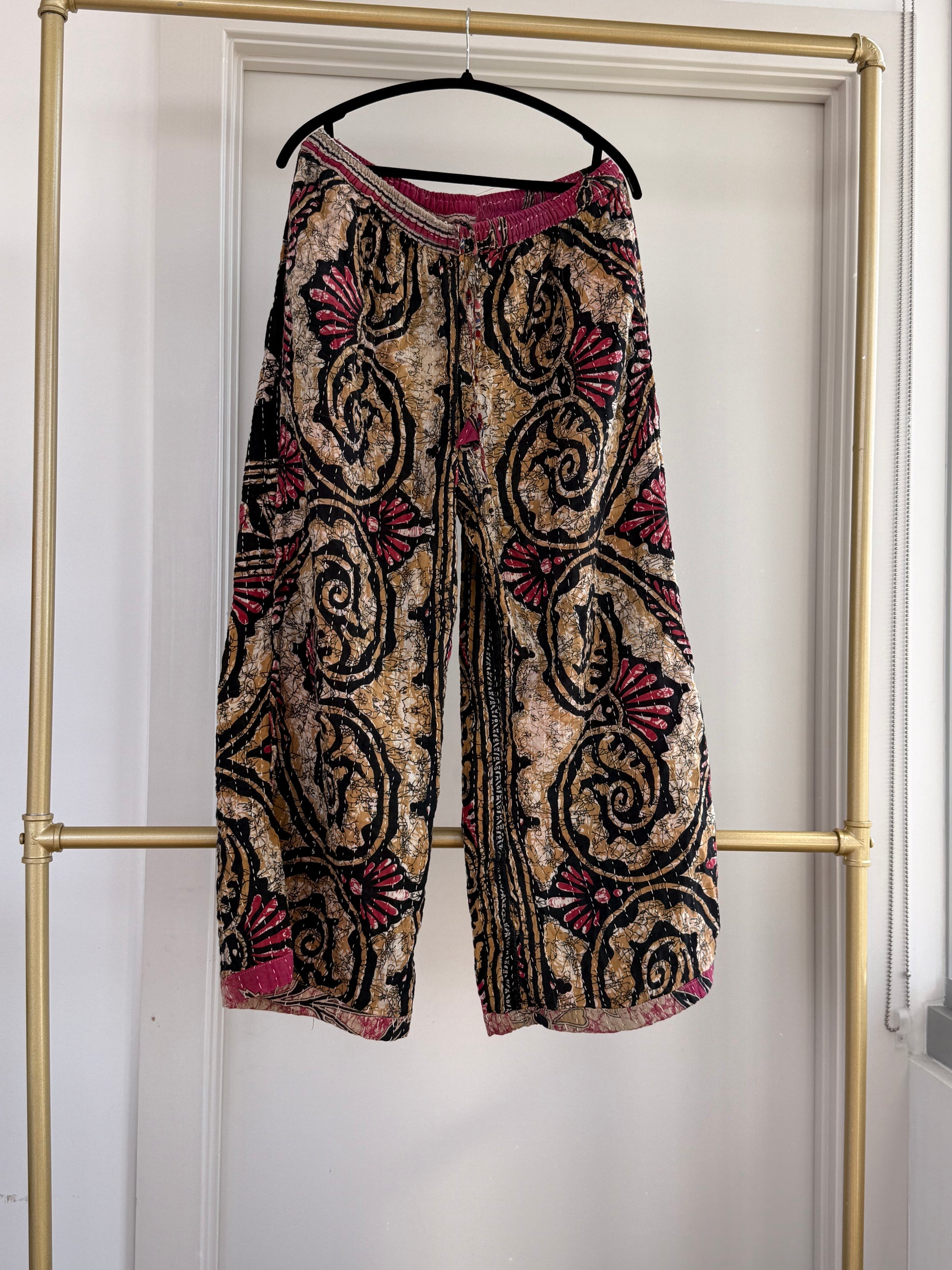 Slip into effortless comfort and one-of-a-kind style with our reversible Kantha lounge pants, made for cozy mornings, creative afternoons, and everything in between. Handcrafted from vintage, hand-stitched Kantha quilts, each pair carries its own story — full of texture, color, and character.