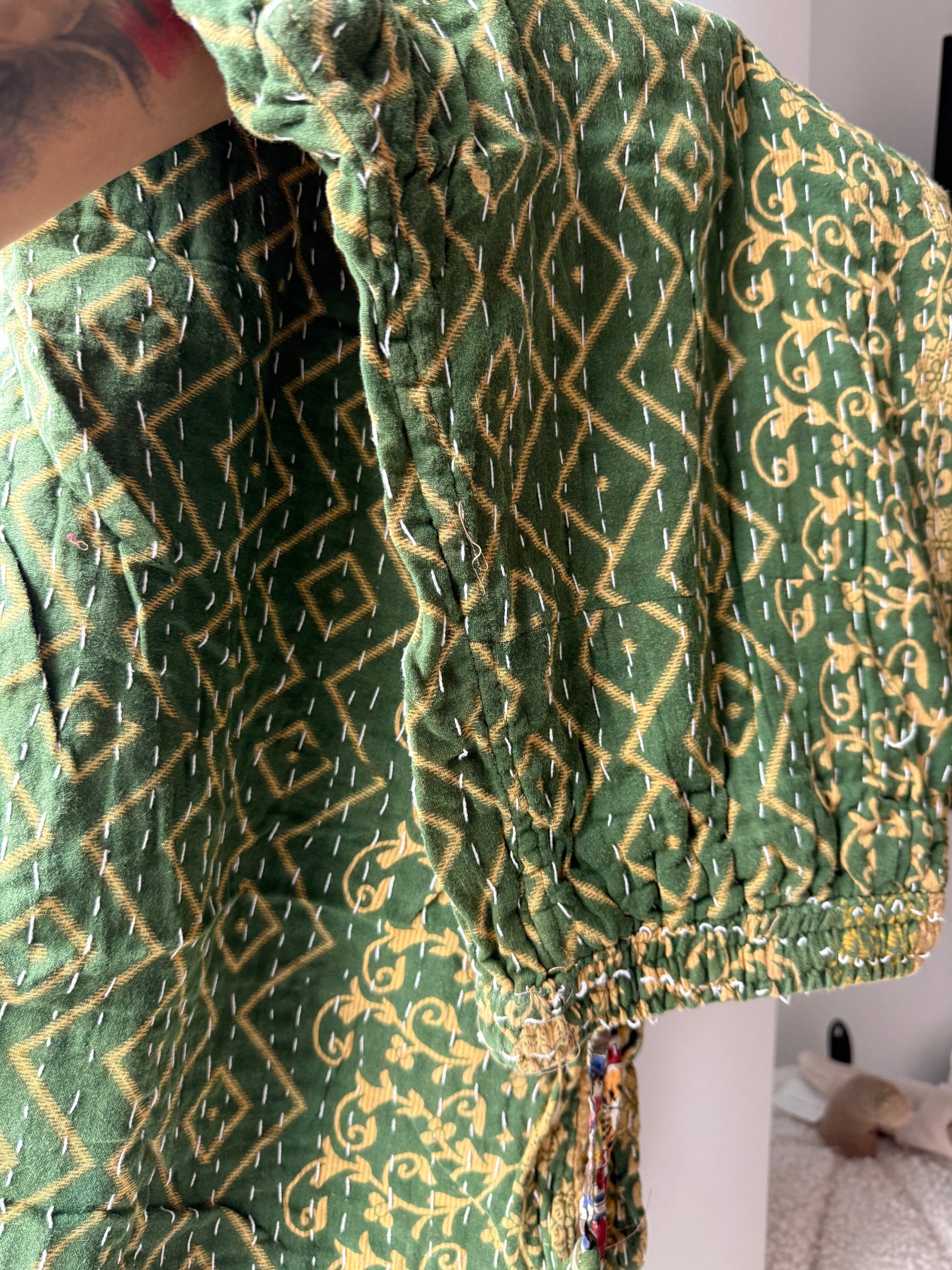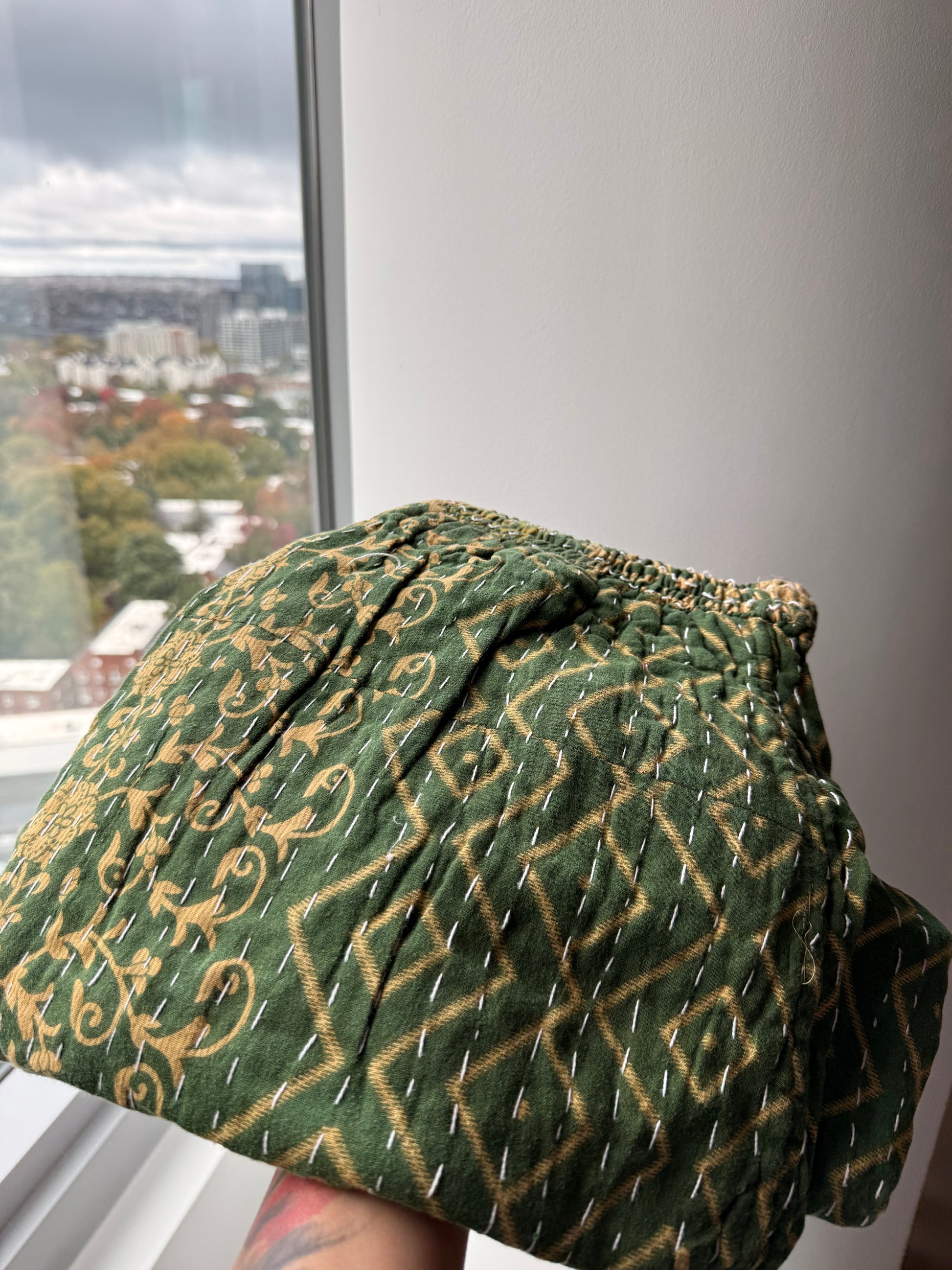 Slip into effortless comfort and one-of-a-kind style with our reversible Kantha lounge pants, made for cozy mornings, creative afternoons, and everything in between. Handcrafted from vintage, hand-stitched Kantha quilts, each pair carries its own story — full of texture, color, and character.